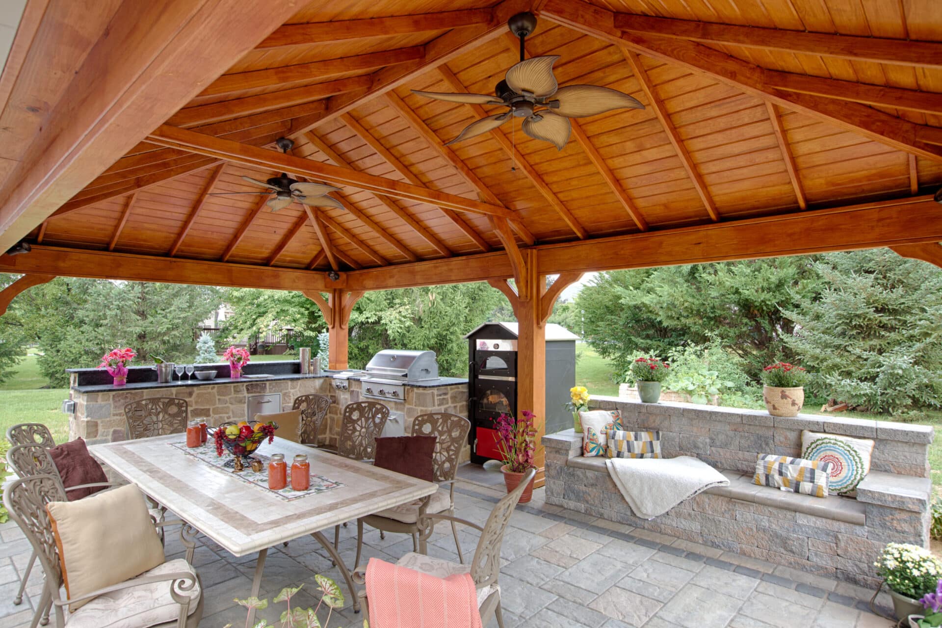 Add a fireplace and comfy furniture to create a warm, home-like vibe. It’s great to sit out during the summer months next to a fire. The benefit is you can use this space year-round! Imagine sitting under your Pavilion next to the fire sipping cocoa during the winter months.