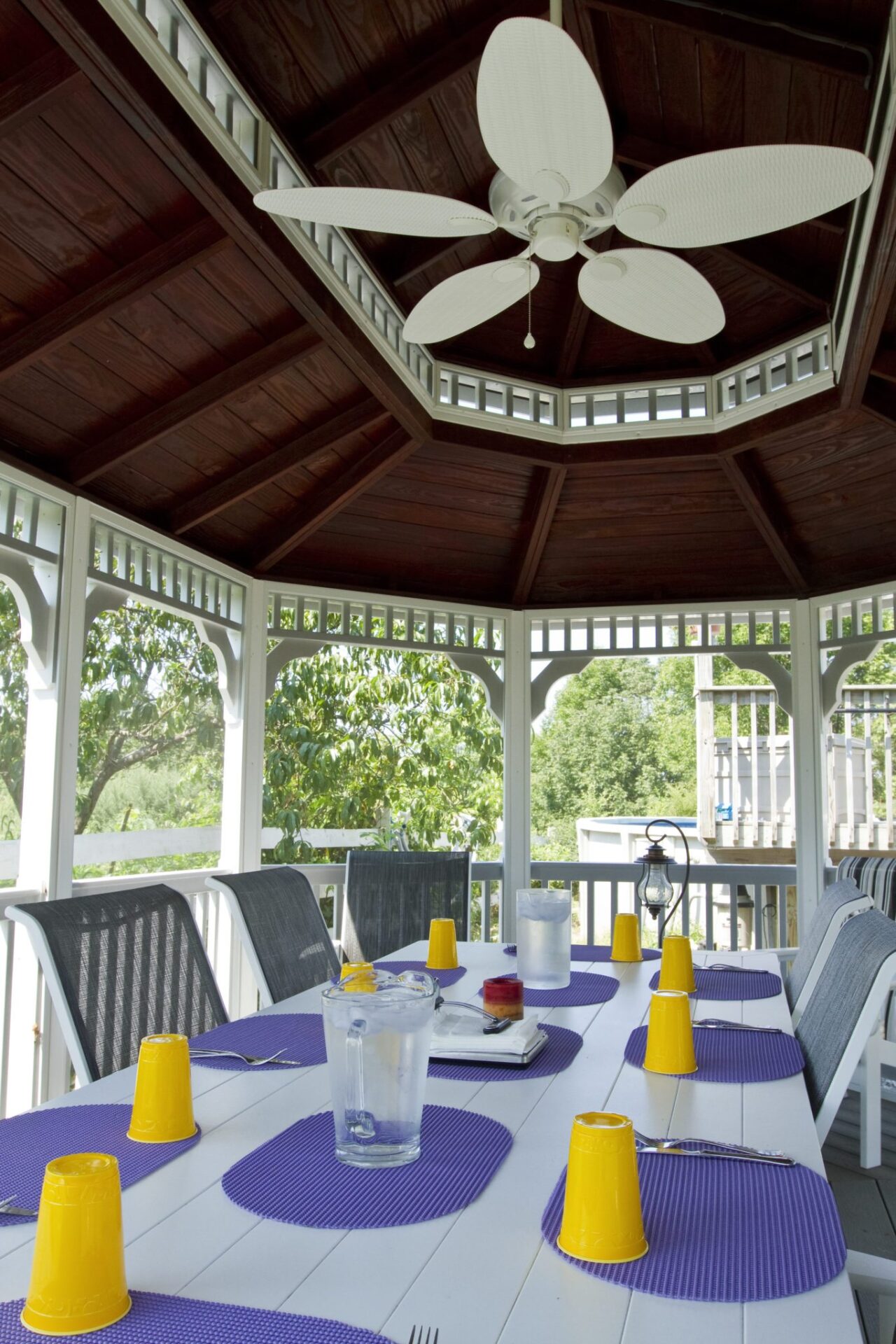 On a humid day or evening, it is nice to seek out some shade or enjoy the evening under a Gazebo. The best addition to a Gazebo space is an exterior ceiling fan. A ceiling fan not only accents the décor, but a better purpose is to circulate the air. There is a variety of sizes and styles of ceiling fans to chose from. When selecting a ceiling fan, think of the structure and space style. What do you want the area to express? Find exterior ceiling fans