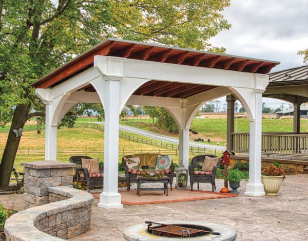14′ x 14′ Traditional Pavilion | All Weather Almond Vinyl, Mahogany Ceiling Finish, Classic Asphalt, Deluxe Tapered Columns
