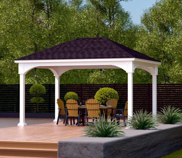 16′ x 14′ A-Frame Pavilion 8×8″ Posts | All Weather White Vinyl, Mahogany Ceiling Finish, Classic Asphalt