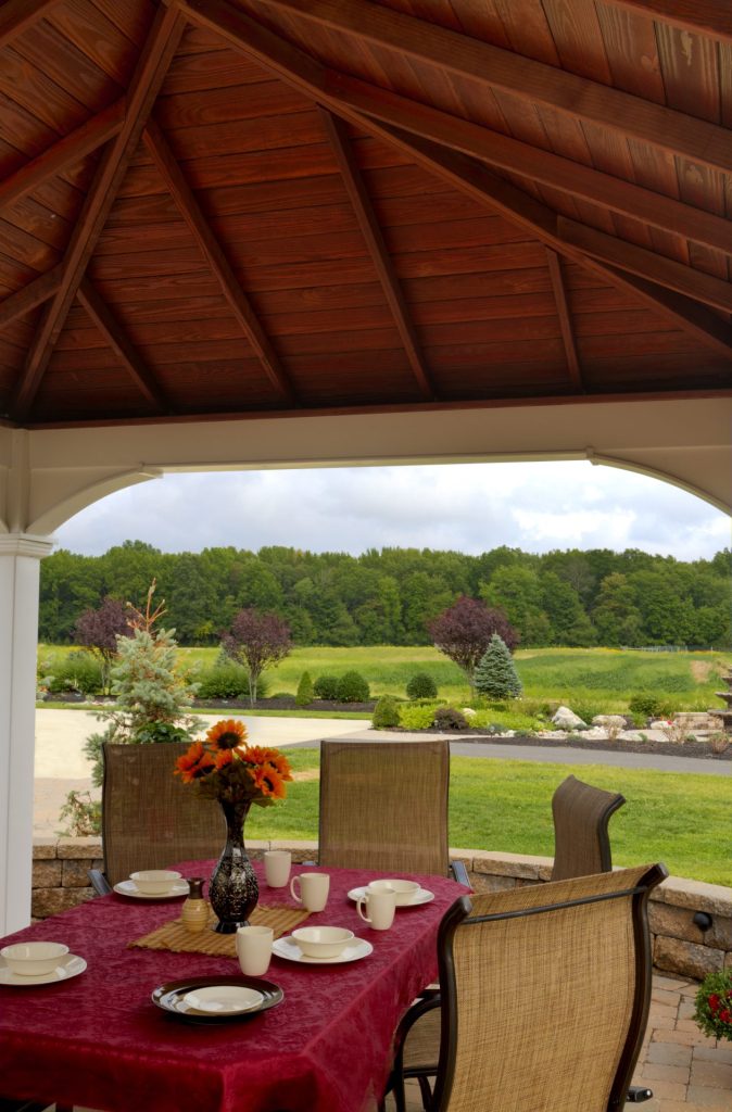 10′ x 14′ Santa Fe Pavilion | All Weather White Vinyl, Mahogany Ceiling Finish, Metal Roof, Enhanced Posts