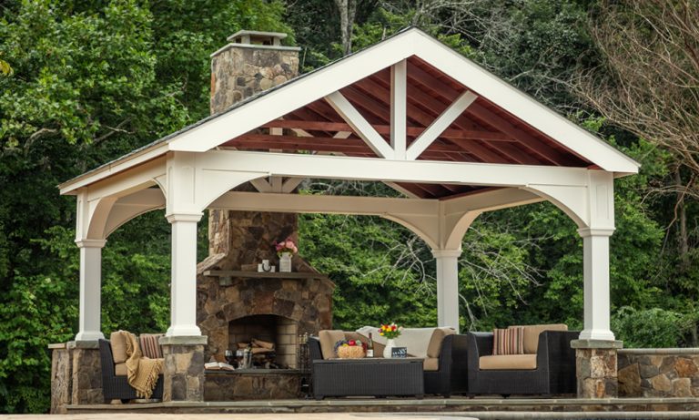 12′ x 14′ A-Frame Pavilion | All Weather White Vinyl, Mahogany Ceiling Finish, 6″ Higher Posts