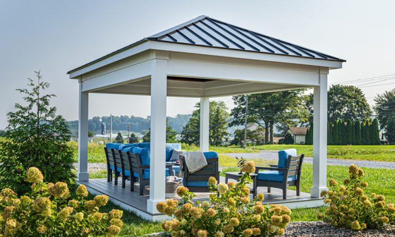 10′ x 16′ Hampton Pavilion | All Weather White Vinyl, Sepia Brown Ceiling Finish, Metal Roof, Deluxe Tapered Columns